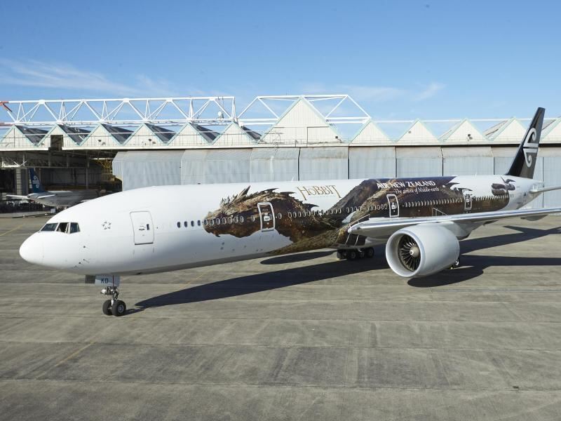 Eine Boeing 777-300 der Air New Zealand, bemalt mit dem Drachen Smaug aus dem Hobbit-Film. Foto: Air New Zealand