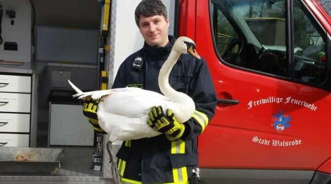 WALSRODE. Die Feuerwehr in Walsrode im Landkreis Hildesheim hat am Gründonnerstag einen Schwan aus einer misslichen Lage gerettet. Das Tier habe sich am Nachmittag in einer Astgabel in etwa 25 Meter Höhe verfangen, teilte die Feuerwehr mit. Der Schwan war demnach verletzt und konnte sich nicht selbst befreien. Weil der Baum auf moorigem Boden stand, kamen die Einsatzkräfte mit einer Leiter nicht an den Schwan heran. Mangels anderer Lösungen wurde der Baum schließlich gefällt. Die Feuerwehr gab den geretteten Schwan am Ende in die Obhut eines Tierarztes. (dpa)