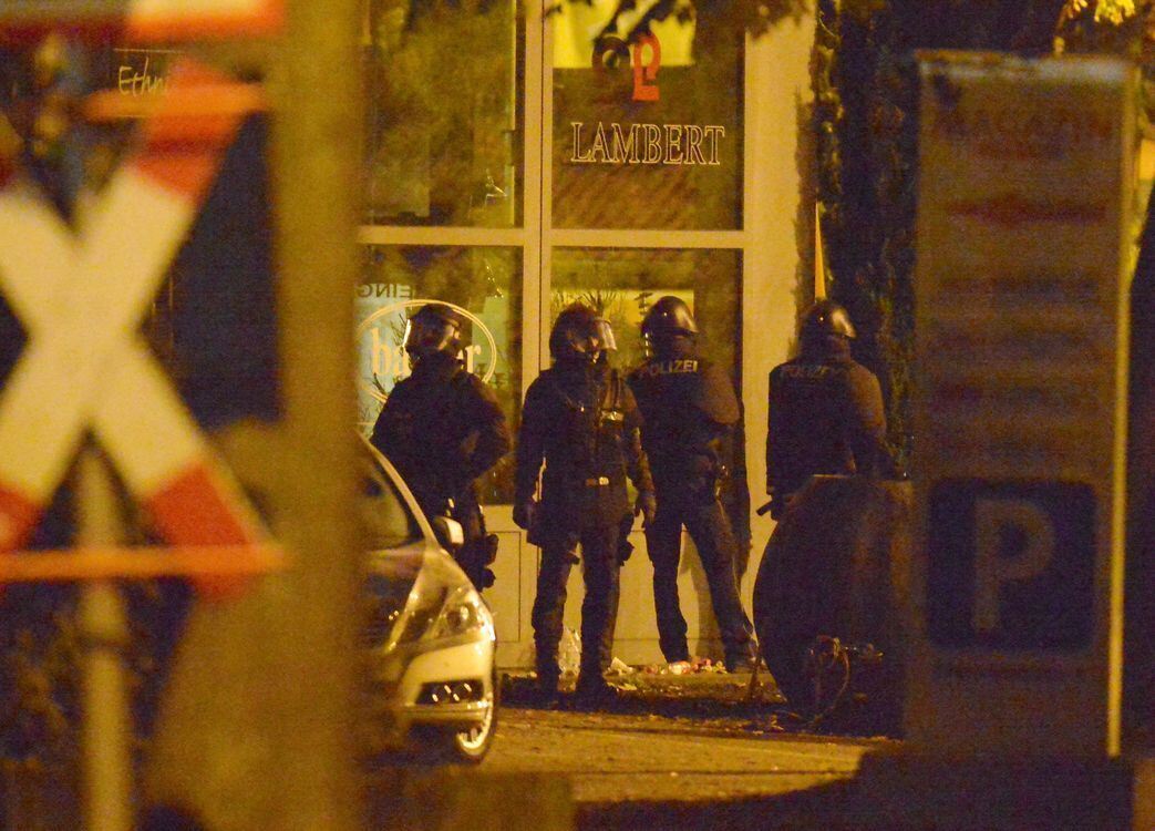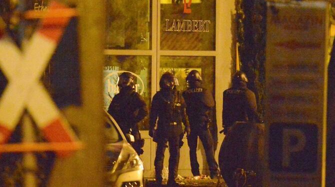 SEK-Beamte stehen am 24. Oktober 2013 in Freiburg (Baden-Württemberg) an der Straße vor einem Imbiss. Ein 36-jähriger Mann hält nach Polizeiangaben zwölf Menschen in einem Schnellimbiss fest. FOTO: DPA