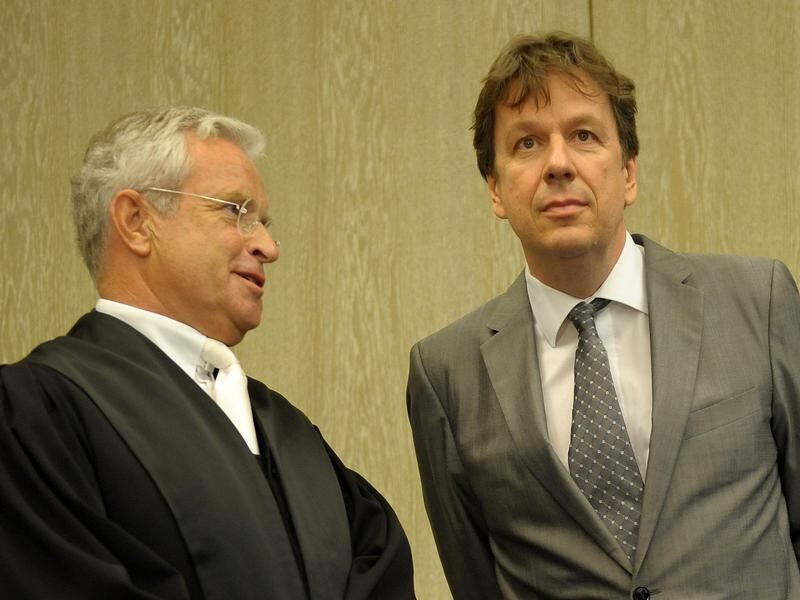 Der Wettermoderator Jörg Kachelmann mit seinem Anwalt Johann Schwenn vor der Urteilsverkündung.