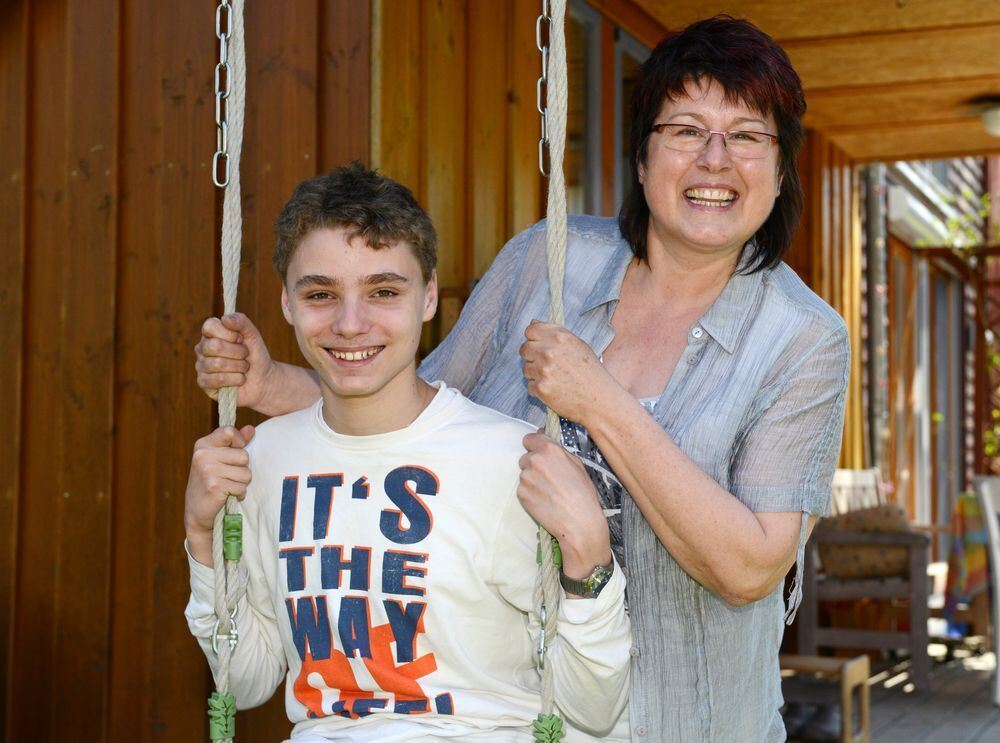 Angelika Gattmann und ihr Pflegesohn Waldemar posieren in Konstanz am Bodensee zusammen für den Fotografen. Gattmann betreut mehrere Pflegekinder. Foto: dpa