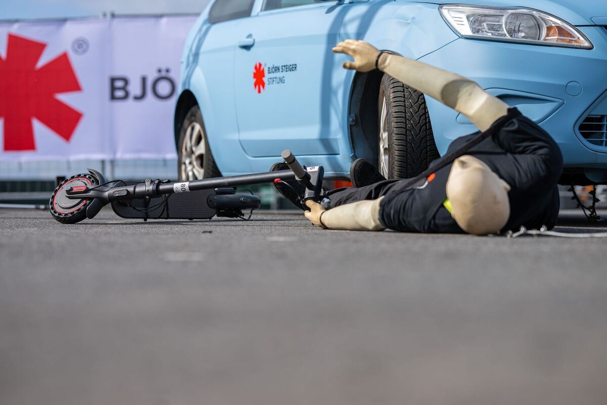 Das Unfallszenario, das bei einem Crashtest der Björn-Steiger-Unfallforschung mit einem Dummy in Münster gezeigt wird, ist der häufigste Ablauf für Unfälle zwischen Pkw und E-Scootern, von denen nach den jüngsten vorliegenden Zahlen 2023 knapp eine Million auf deutschen Straßen unterwegs waren.