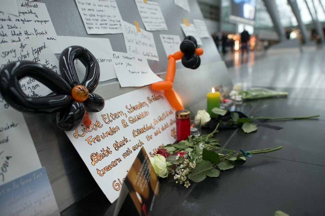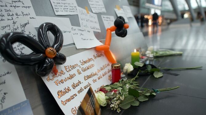 Kerzen, Blumen und Beileidsbekundungen für die Opfer des abgestürzten Germanwings-Fluges 4U 9525 stehen in der Abflughalle des Flughafens Düsseldorf.