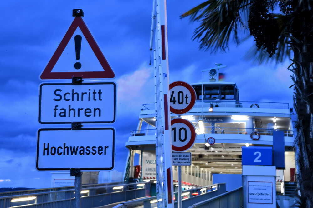 Schilder mit der Aufschrift »Schritt fahren -Hochwasser« weisen am Fährhafen von Meersburg auf das Hochwasser im Bodensee hin. Foto: Felix Kästle/dpa