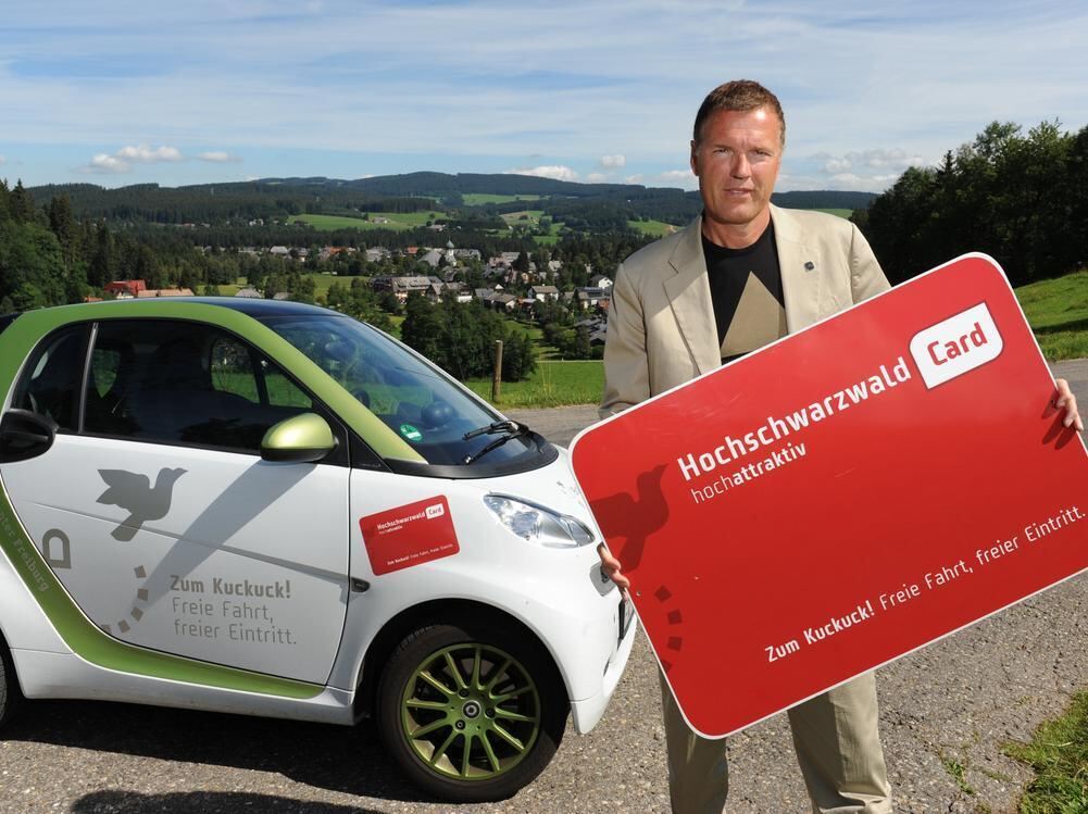 Thorsten Rudolph, Geschäftsführer der Hochschwarzwald Tourismus GmbH mit der Hochschwarzwald Card. Urlauber in der Region, die in einem der teilnehmenden Betriebe übernachten, erhalten die Karte kostenlos und können mit ihr gratis verschiedene kostenpflichtige Urlaubsaktivitäten nutzen.