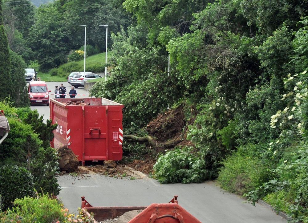 Ein abgerutschter Hang blockiert nach einem Starkregen in Nürtingen eine Straße.