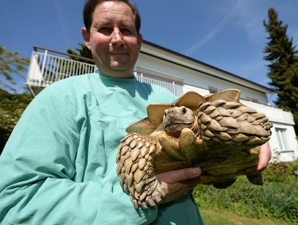 Tierarzt Heinrich Preiß hält die Riesenschildkröte Clotherich in der Hand. Das Tier lebt bereits seit zehn Jahren am Bodensee.