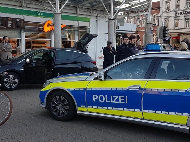 Einsatzkräfte der Polizei vor dem Geschäftshaus in Heidelberg. Direkt davor hatte der Autofahrer mehrere Fußgänger angefahren. Foto: R. Priebe