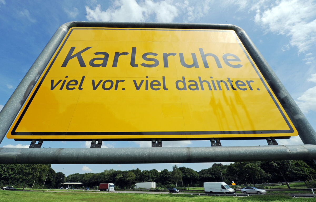 An der Karlsruher Südtangente steht ein überdimensionales Ortsschild, auf dem der Karlsruher Werbeslogan »Karlsruhe viel vor. viel dahinter.« steht. Foto:dpa