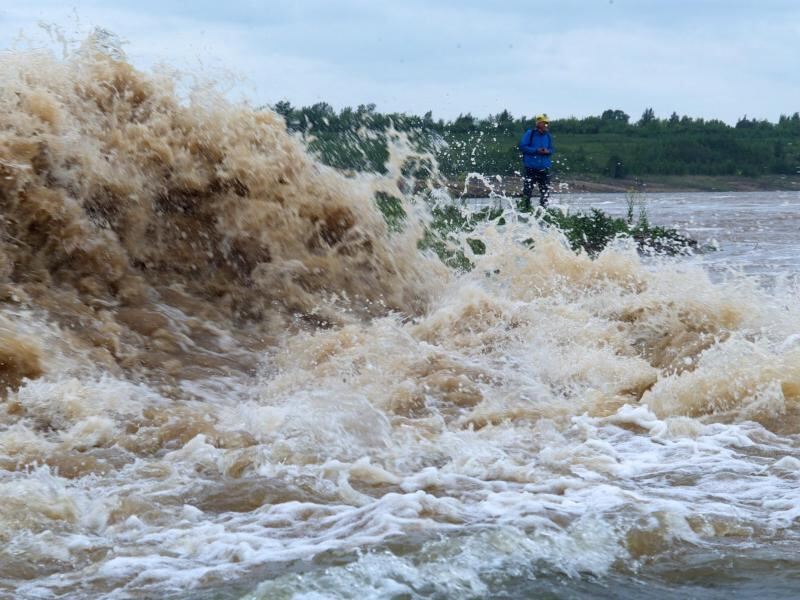 Wassermassen der hochwasserführenden Weißen Elster ergiessen sich bei Zitzschen (Sachsen) in den Zwenkauer See. Foto: Peter Endig