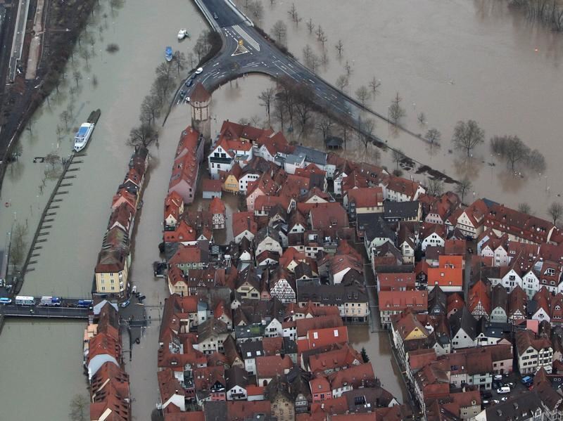 Die Luftaufnahme vom Mittwoch zeigt die überflutete Altstadt von Wertheim.