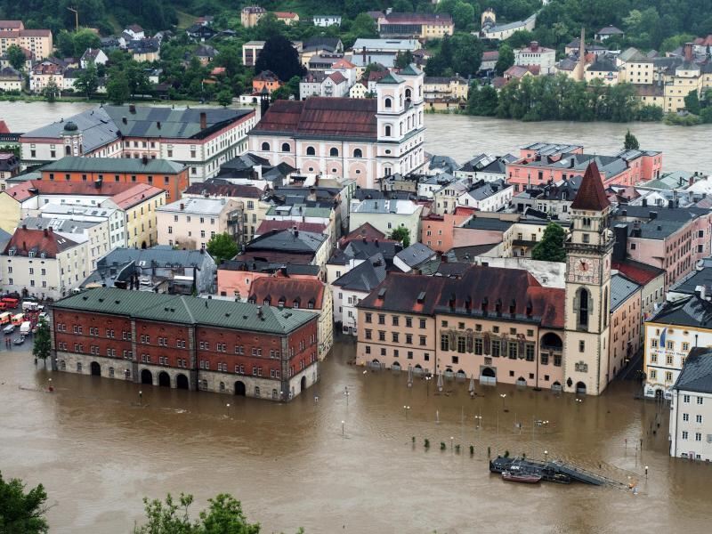 Teile der Altstadt von Passau sind vom Hochwasser von Inn (oben) und Donau überflutet. Foto: Armin Weigel
