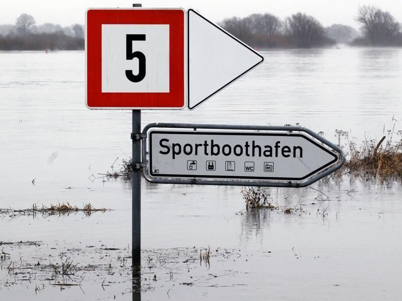 Hier geht es lang: Der Wegweiser zum Sportboothafen in der Nähe des Hafens von Bleckede im Hochwasser der Elbe.