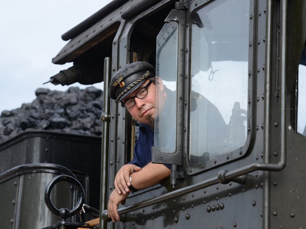 Lokomotivführer Juri Hucklenbroich schaut in Blumberg aus dem Führerhaus einer Lokomitive der Sauschwänzlebahn.