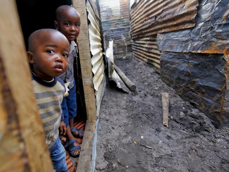 Zwei Kinder blicken in einem Slum in Kapstadt/Südafrika: Mit dem weltweiten Wachstum der Städte nimmt auch die Zahl der Kinder zu, die in Armenvierteln aufwachsen. Foto: epa