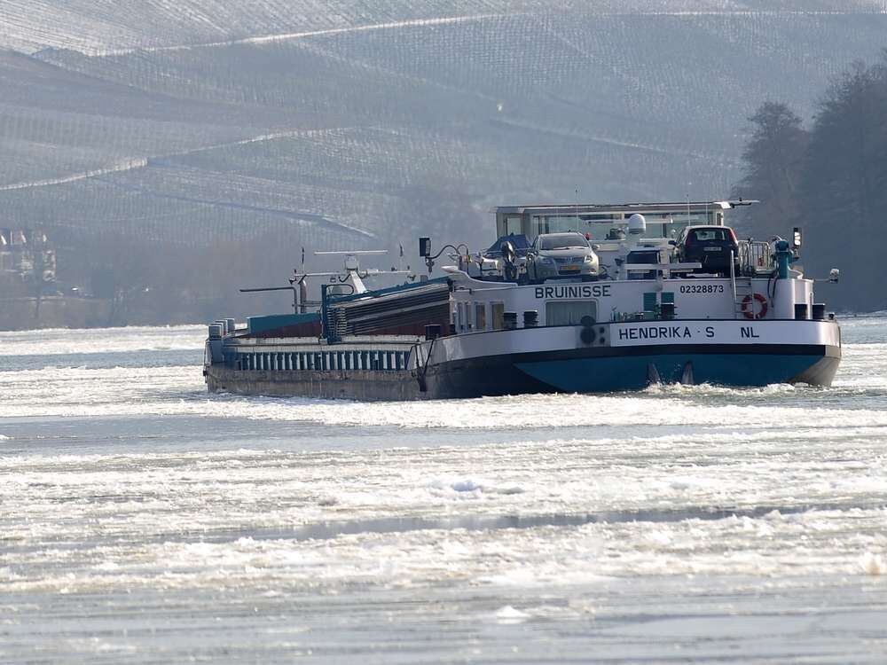 So wie auf der Mosel im Bild kämpfen die Binnenschiffer überall mit dem Eis.