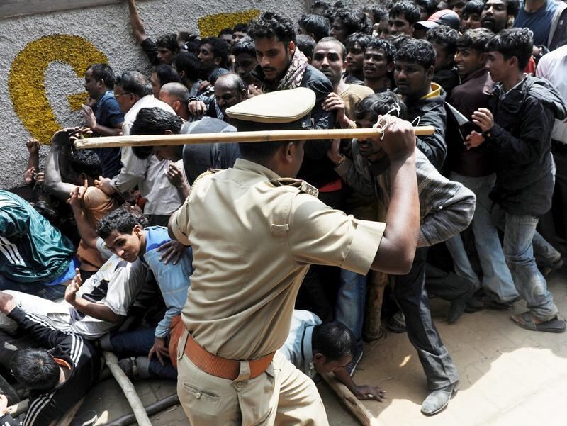 Ein indischer Polizist setzt seinen Schlagstock ein (Archivbild). In Ostindien haben entlassene Arbeiter einen Manager verbrannt.