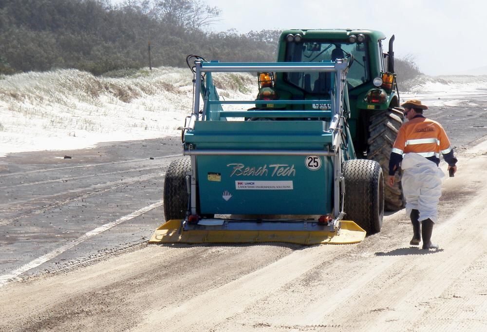 Ein Strandreinigungsgerät von Kassbohrer, mit dem auch Ölklumpen aufgesammelt werden können.