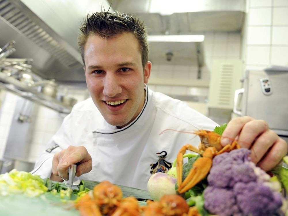 Der Koch Sören Anders steht im Karlsruher Restaurant Oberländer Weinstube in der Küche.
