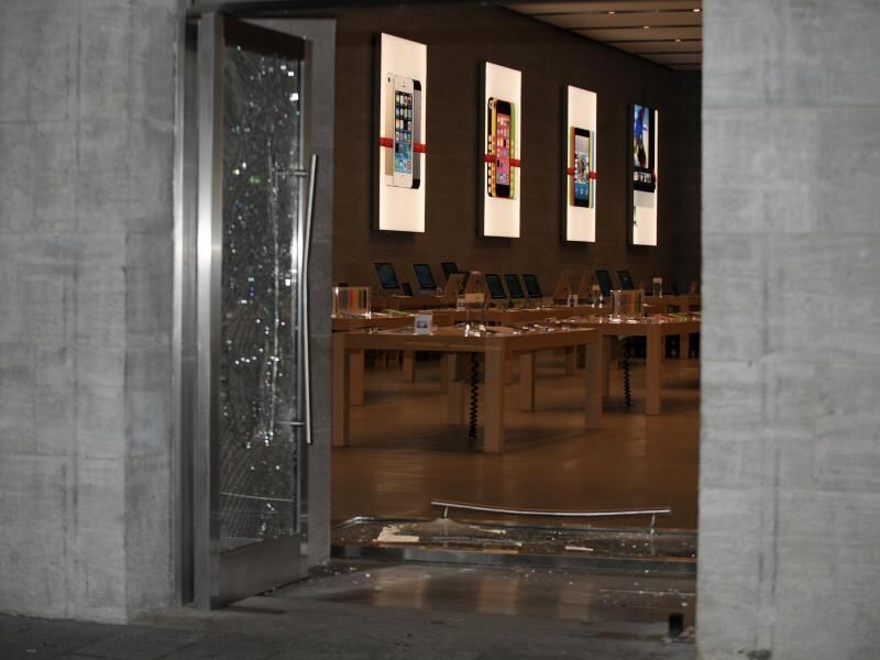 Zerstörter Eingangsbereich des Apple Stores in Berlin. Foto: Oliver Mehlis