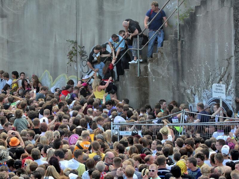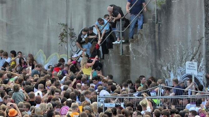 Kurz vor dem Unglück bei der Loveparade am 24.07.2010 stehen Menschen dicht gedrängt an einem Tunnelausgang in Duisburg.