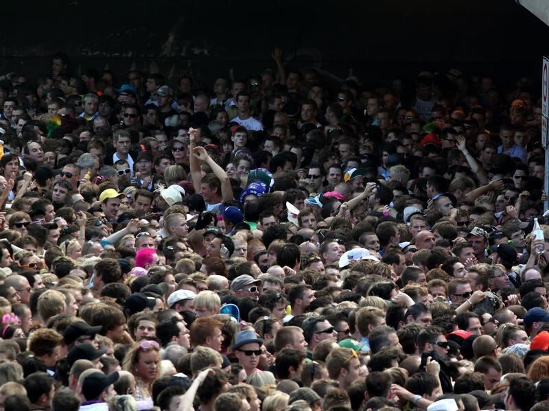 Kurz vor dem Unglück stehen die Menschen dichtgedrängt am Tunnelausgang in Duisburg.