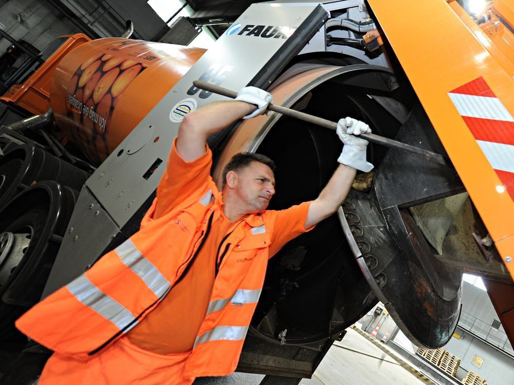 Ein Müllmann reinigt in Stuttgart im Müllverbrennungskraftwerk Münster ein Müllauto.