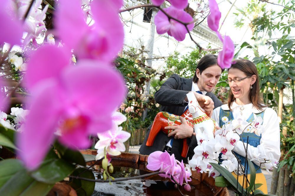 Bettina Gräfin Bernadotte (rechts) und ihr Bruder Björn posieren kurz vor einer Pressekonferenz auf der Insel Mainau im Palmenhaus zwischen Orchideen.