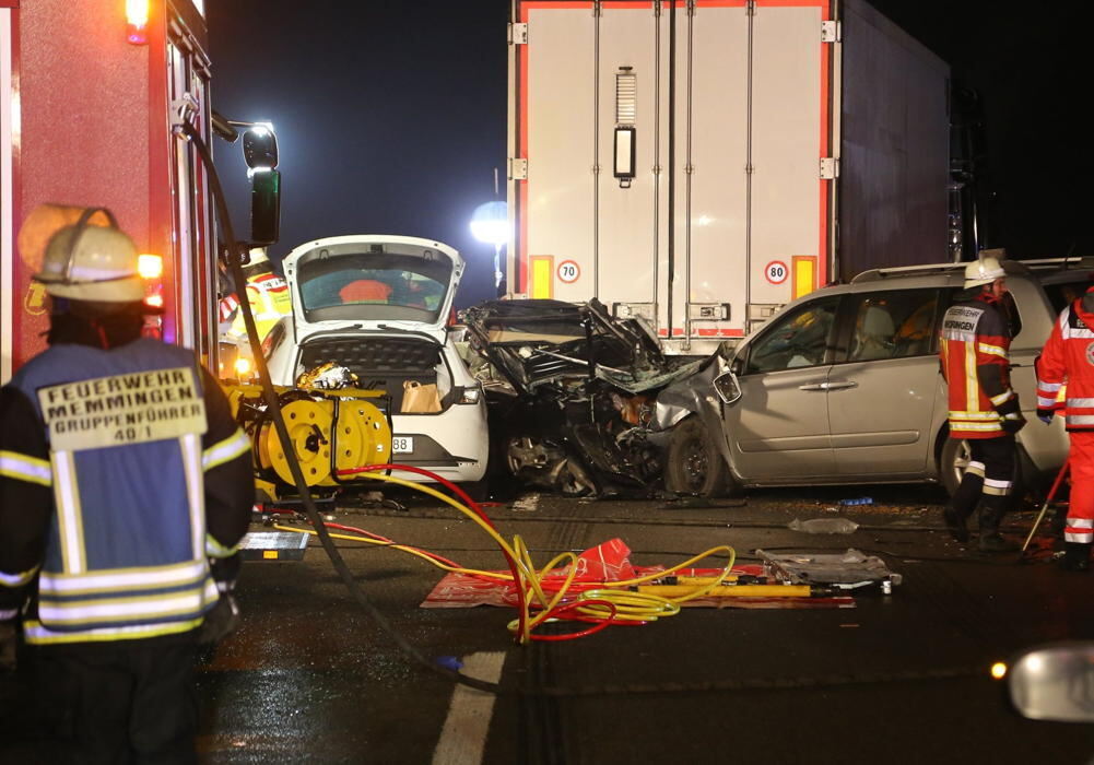 Autowracks und LKWs stehen nach einem Unfall im Nebel auf der Autobahn 7 nahe Bad Grönenbach im Unterallgäu.