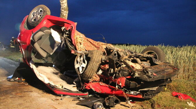 Ein verunfallter Pkw liegt auf einer Straße zwischen Weikersheim und Röttingen auf der Straße. Bei dem Unfall wurden zwei Menschen getötet und drei weitere schwer verletzt. Foto: Rene Engmann/dpa
