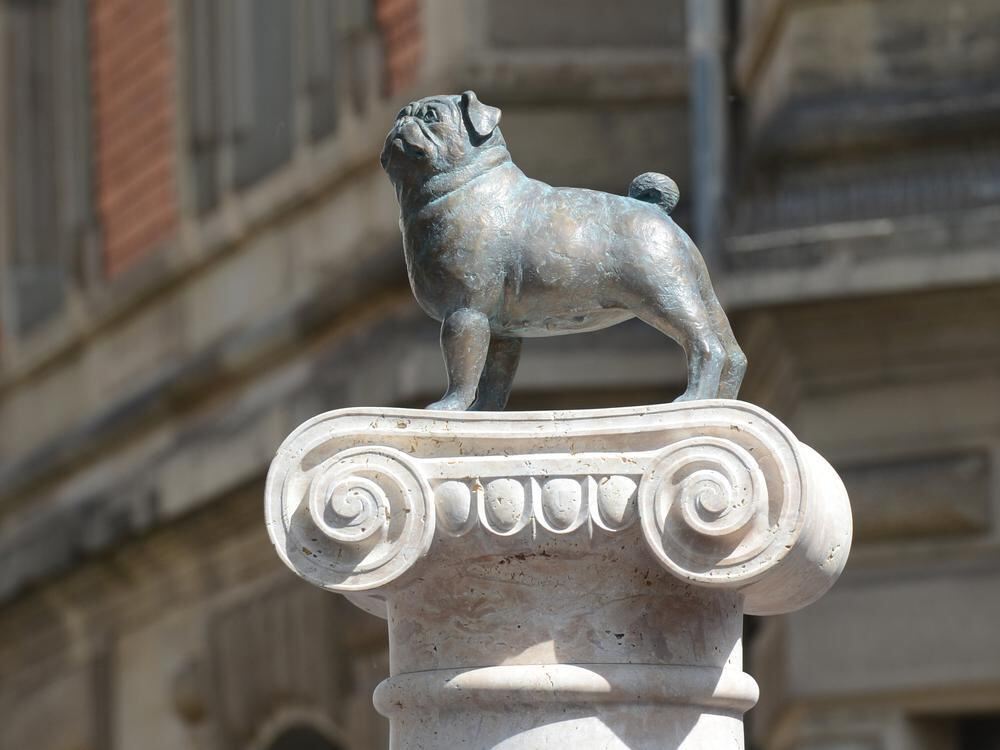 Der neue Mops auf der Loriot-Gedächtnissäule am Eugensplatz.