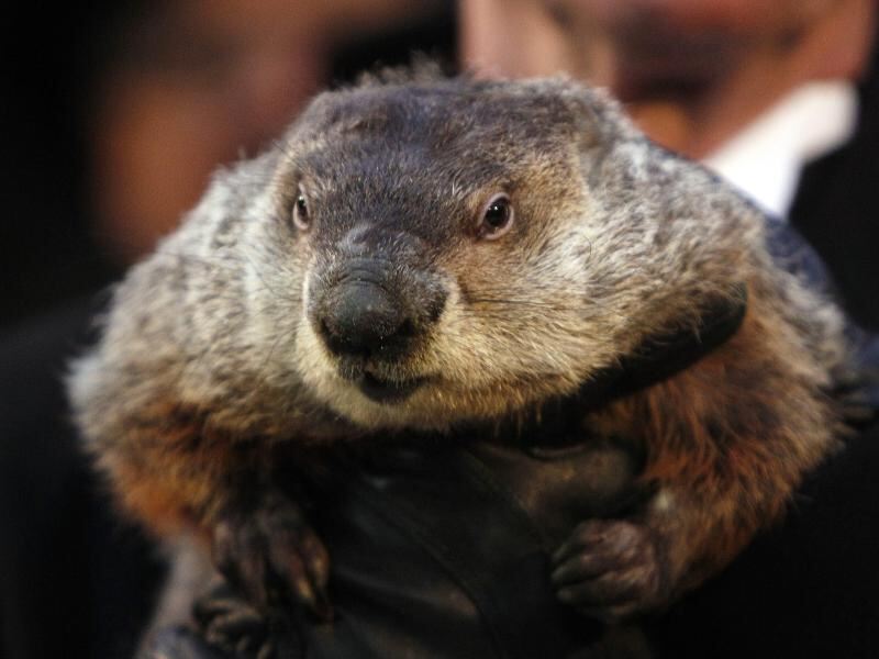 Murmeltier Phil bei der Wettervorhersage in Gobblers Knob in Punxsutawney, Pennsylvania, USA 2013. Foto: David Maxwell