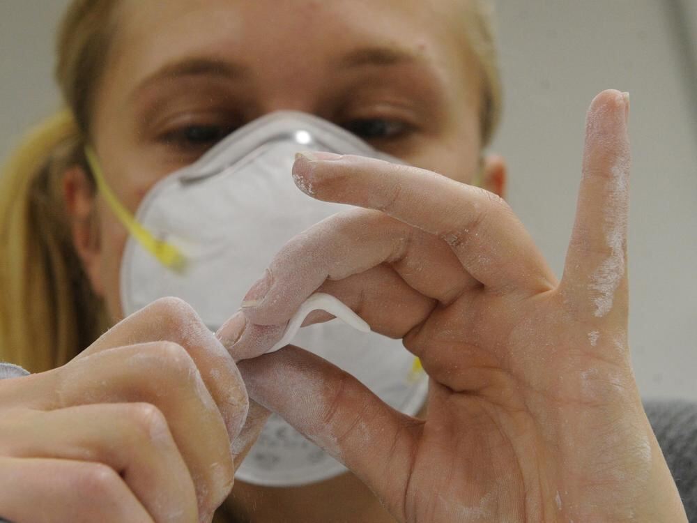 Sarah Hölzer arbeitet an der Hochschule Pforzheim in der Fakultät für Gestaltung an einem Schmuckstück das aus einer Dentalkeramik besteht.