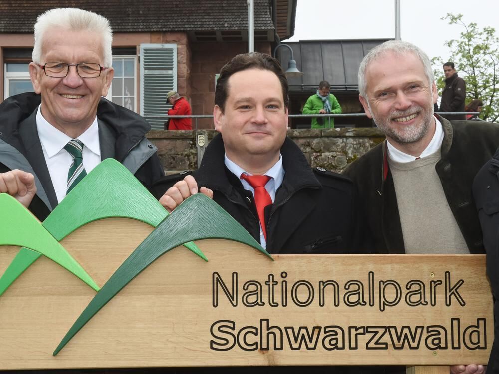 Über die Eröffnung des Nationalpark Schwarzwald am Ruhestein in Seebach freuen sich Winfried Kretschmann (Bündnis 90/Die Grünen), Ministerpräsident von Baden-Württemberg, Alexander Bonde (Grüne), Minister für ländlichen Raum in Baden-Württemberg und Wolfgang Schlund, Direktor des Nationalparks.