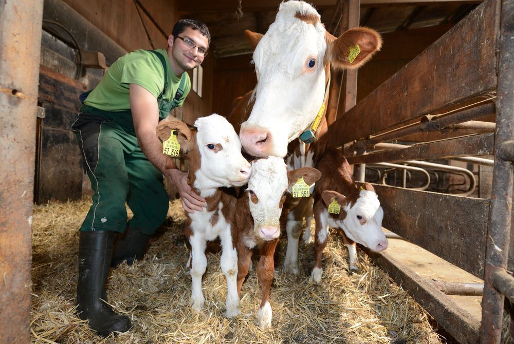 Landwirt Martin Schmieder steht am 13.04.2015 im Stall auf dem Prinzbachhof in Fischerbach (Baden-Württemberg) neben den Drillingskälber Neo, Nelli und Nina und dem Muttertier Nora. Die Wahrscheinlichkeit für Kälber-Drillinge liegt bei 0,0007 Prozent. Foto: Patrick Seeger/dpa