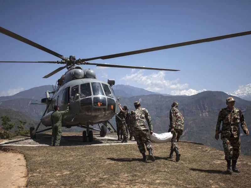 Nepalesische Soldaten beladen einen Hubschrauber: Die schwer vom Beben getroffenen Regionen im Norden sind nicht über Straßen zu erreichen. Foto: Hemanta Shrestha