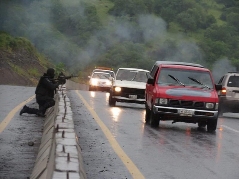 Ein Polizist liefert sich einen Schusswechsel mit der Drogenmafia in Apaztingan, Mexiko. Foto: Stringer