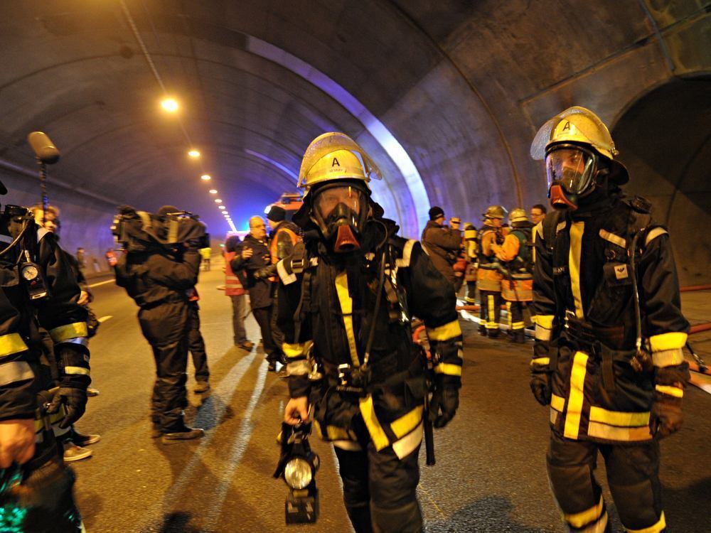 Gespenstisch auch als Übung: Feuerwehrmänner im verrauchten Engelbergtunnel.