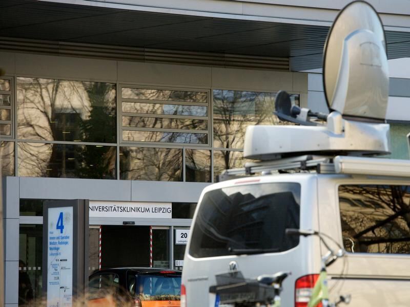 Ein Übertragungswagen des Fernsehens vor dem Eingang des Universitätsklinikums in Leipzig. Foto: Peter Endig