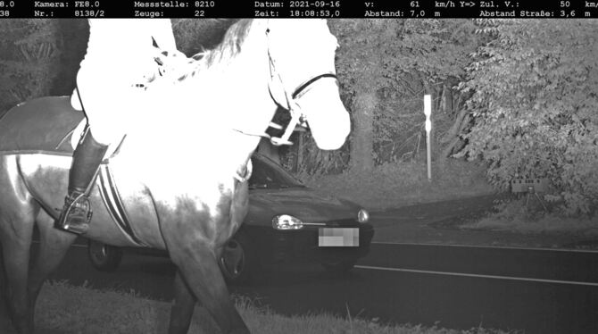 RATINGEN. Dank eines Pferdes ist ein Autofahrer in Ratingen bei Düsseldorf einem Bußgeld entkommen. Genau in dem Moment, als ein mobiler Blitzer wegen des zu schnellen Kraftfahrzeuges auslöste, ritt eine Reiterin nah an der Linse des Messgerätes vorbei, wie die Polizei am Freitag mitteilte. Das Tier verdeckte dabei größtenteils das Auto auf dem Blitzerfoto. Glück für den Autofahrer, erklärte die Polizei. Für die weitere Verfolgung der Geschwindigkeitsübertretung sei das Foto damit unbrauchbar. Statt mit 50 sei der Autofahrer am Donnerstagabend auf der Verbindungsstraße mit 61 Stundenkilometern an der Stelle gefahren. Ihm hätte ein Bußgeld von 10 Euro gedroht. (dpa)