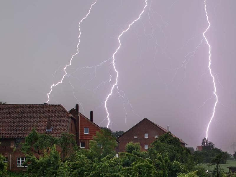 Blitze schlagen am frühen Morgen bei Sehnde in der Region Hannover ein. Foto: Julian Stratenschulte