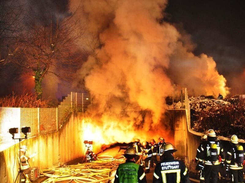 Feuerwehrmänner bei der Bekämpfung des Brandes in der Tiefgarage in Stuttgart. Foto: Andreas Rosar