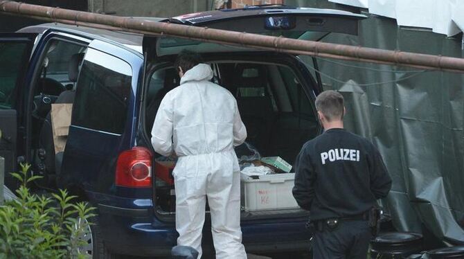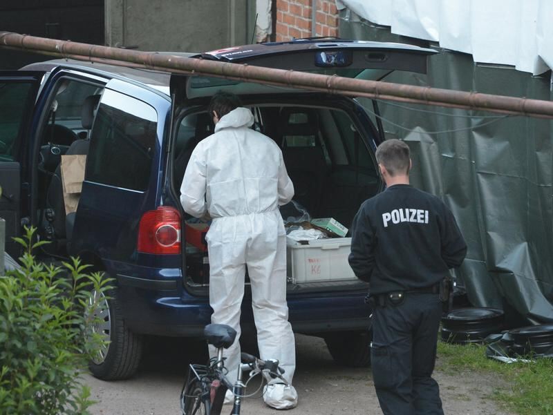 Ermittler der Spurensicherung der Polizei durchsuchen in Kiel das Gelände einer Kfz-Werkstatt. Foto: Marcus Brandt