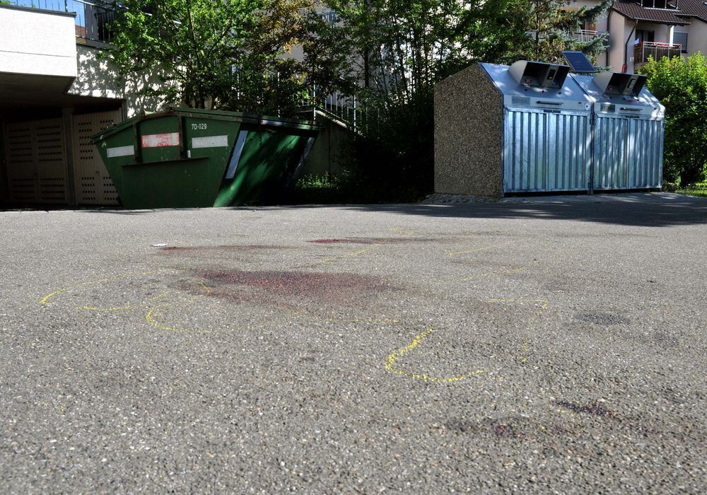 Blutspuren und Kreidezeichnungen sind vor einer Tiefgarageneinfahrt in Stuttgart-Hallschlag zu sehen. Ein Polizist ist hier bei einem Einsatz mit einem Messer attackiert und schwer verletzt worden. Foto: Andreas Rosar/dpa