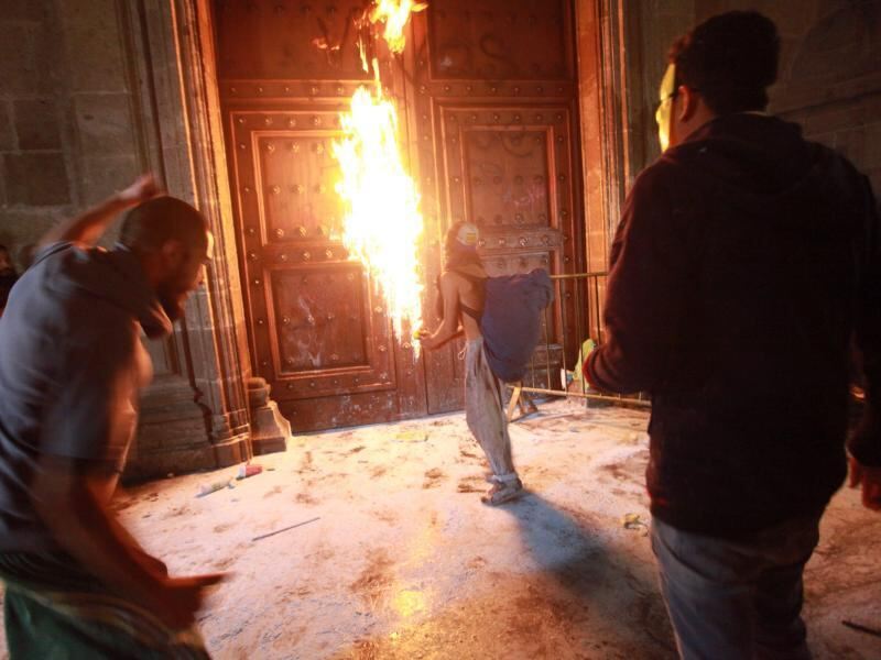 Demonstranten setzen in Mexiko-Stadt ein Tor des Nationalpalastes in Flammen. Foto: Sasheka Gutierrez
