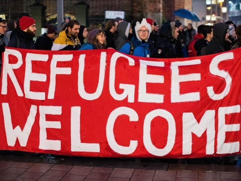 Ein Banner mit der Aufschrift »Refugees welcome« bei einer Demonstration gegen die Verschärfung des Asylrechts in Hamburg. Foto: Daniel Bockwoldt/Archiv