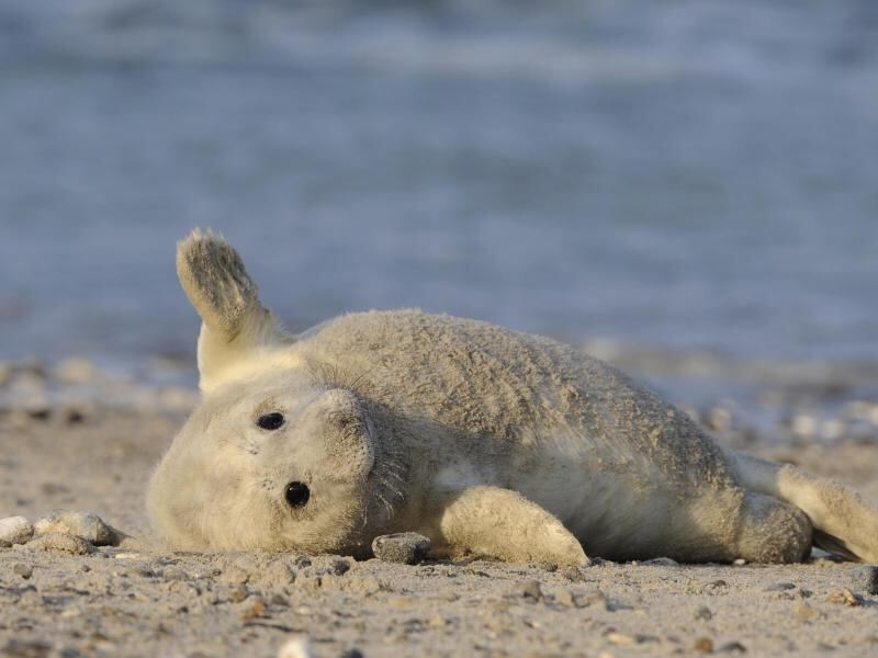 Eine junge Kegelrobbe genießt auf der sogenannten Düne vor Helgoland die Sonne. In der Nordsee hat die Wurfsaison der Kegelrobben begonnen. Foto: Rainer Jensen/Archiv