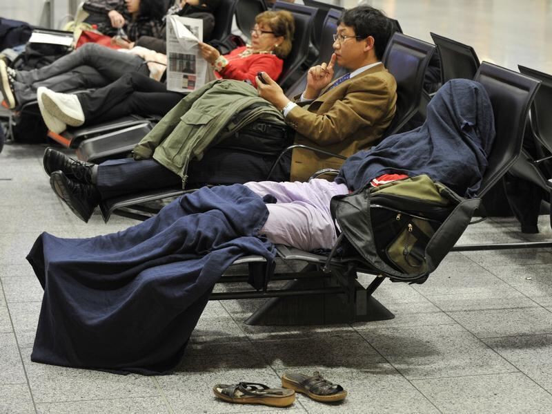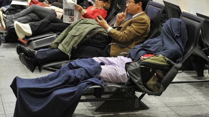 Von Kopf bis Fuß in Decken gewickelt warten gestrandete Passagiere auf eine mögliche Wiederaufnahme des Flugverkehrs.