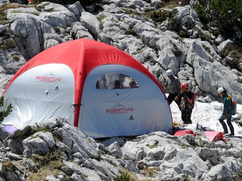 Auf Höhlenrettungen spezialisierte Helfer aus der Schweiz gehen in der Nähe vom Eingang zur Riesending-Schachthöhle zu einem Schutzzelt für das Rettungsteam. Foto: Tobias Hase