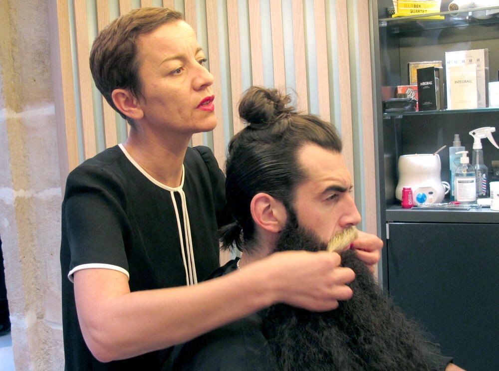 Bart ist in: Die Barbierin Sarah Daniel Hamizi richtet in ihrem Salon den Gesichtsschmuck bei Model Richard Vazquez.